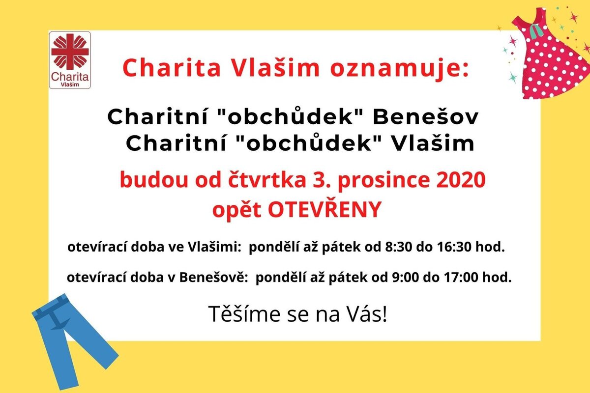 Od čtvrtka 3. prosince 2020 budou opět otevřeny naše charitní "obchůdky" ve Vlašimi a v Benešově.