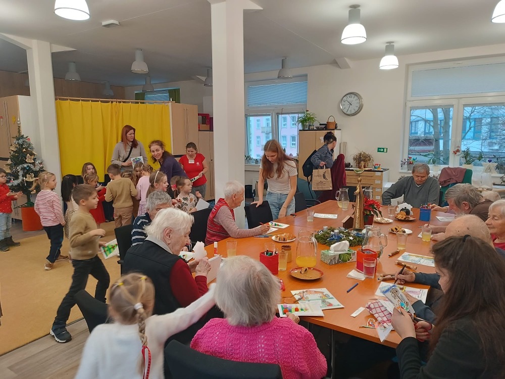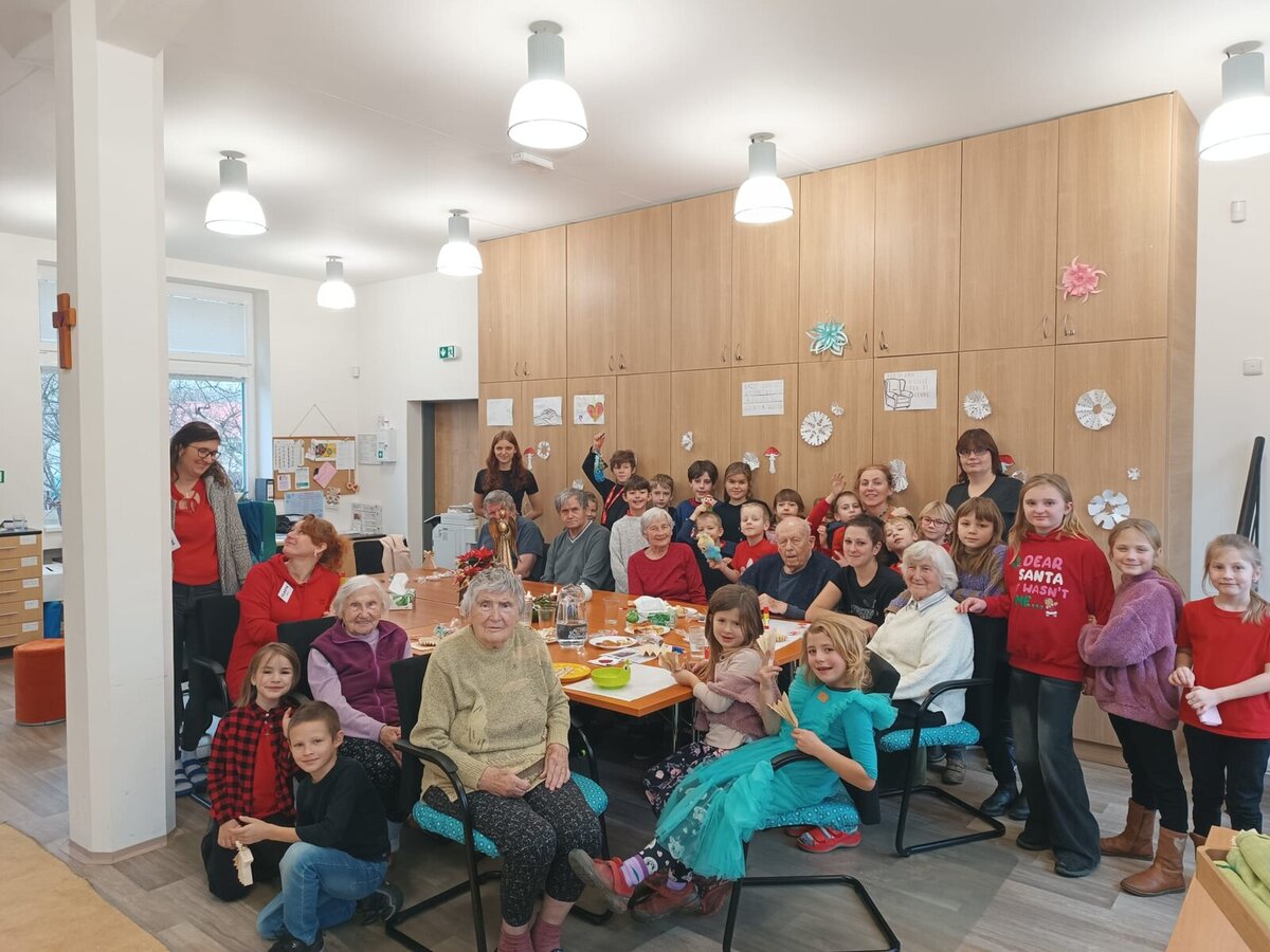 - V úterý 16. 12. dopoledne k nám přijely děti a paní učitelky z MŠ K Vodárně. Se seniory cvičily, zpívaly i vyráběly betlémy. Odpoledne nás čekalo ještě jedno předvánoční setkání, tentokrát s rodinami našich seniorů, při kterém jsme si povídali také o našich přáních nebo výstavbě zázemí stacionářů v Bolince. Z obtisků rukou jsme společně vytvořili vánoční strom plný přání, především zdraví a Božího milosrdenství.