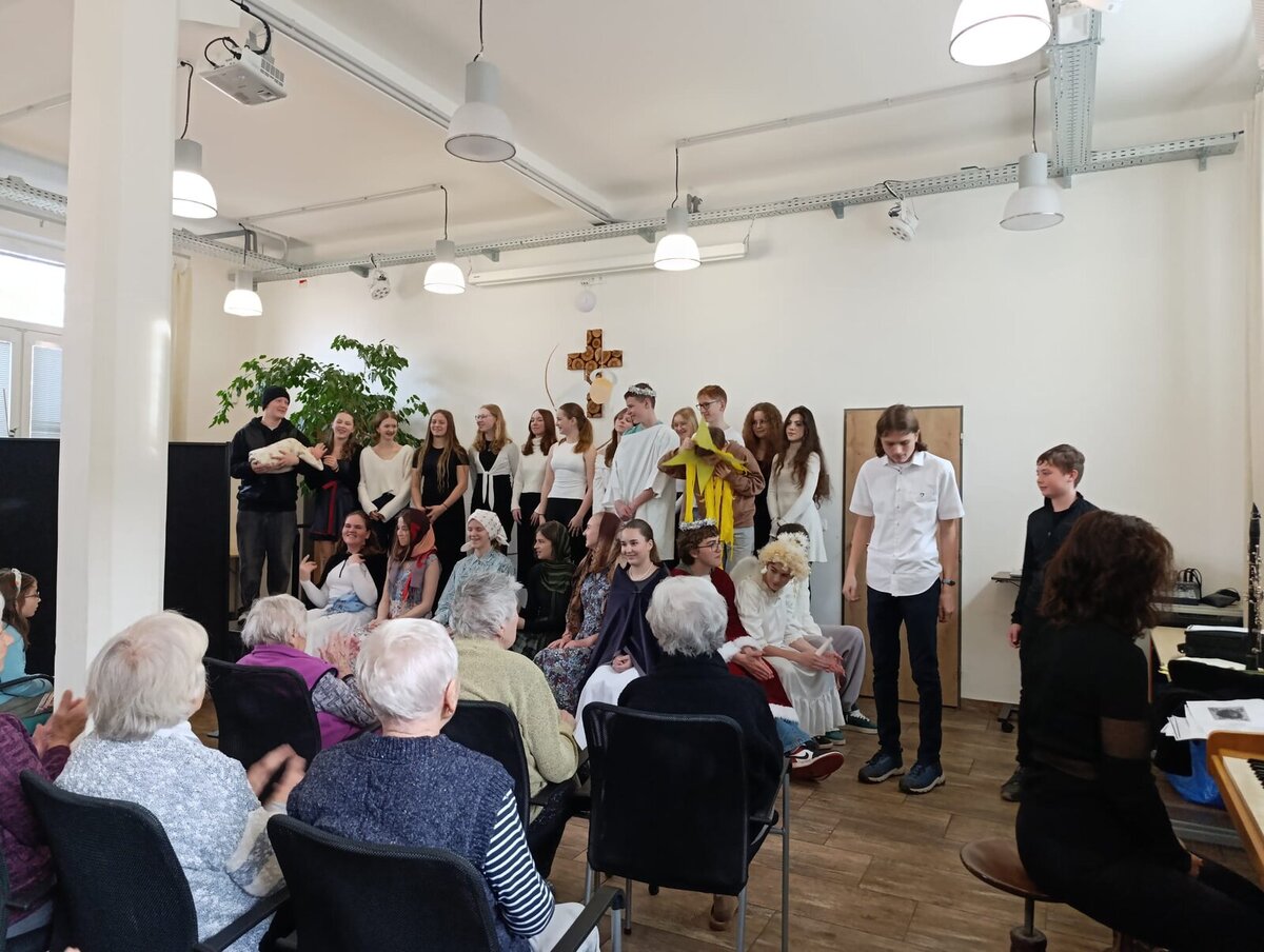 - V úterý 9. 12. po obědě mezi nás přišly studentky a studenti Gymnázia Vlašim se svými pedagožkami. Nacvičili pro nás speciální divadelní vystoupení protkané vánočním příběhem v novodobém pojetí i zpěvem klasických koled.