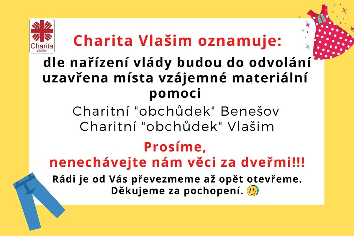 Charita Vlašim oznamuje, že dle nařízení vlády budou do odvolání uzavřena místa vzájemné materiální pomoci!