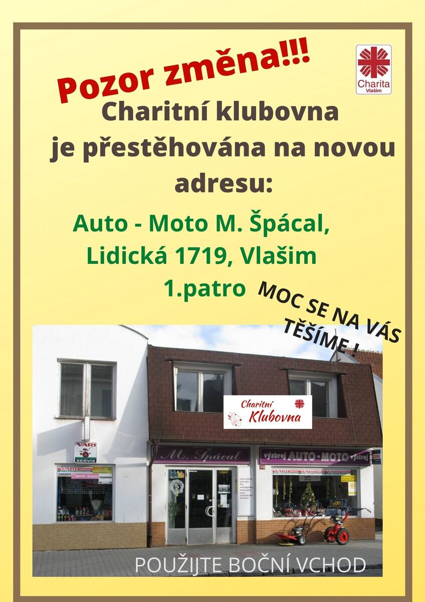 V červnu opět otevřeme naši Charitní klubovnu. Pozor změna: Charitní klubovna je přestěhována na novou adresu: Auto - Moto M. Špácal, Lidická 1719, Vlašim (vchod z boku). Na jaké akce se můžete těšit se dozvíte zde. Pokračovat budou i pravidelné akce jako: Klub trénování pamněti - každé úterý od 14:00 do 15:30 Klub seniorů - každý čtvrtek od 14:00 do 15:30
