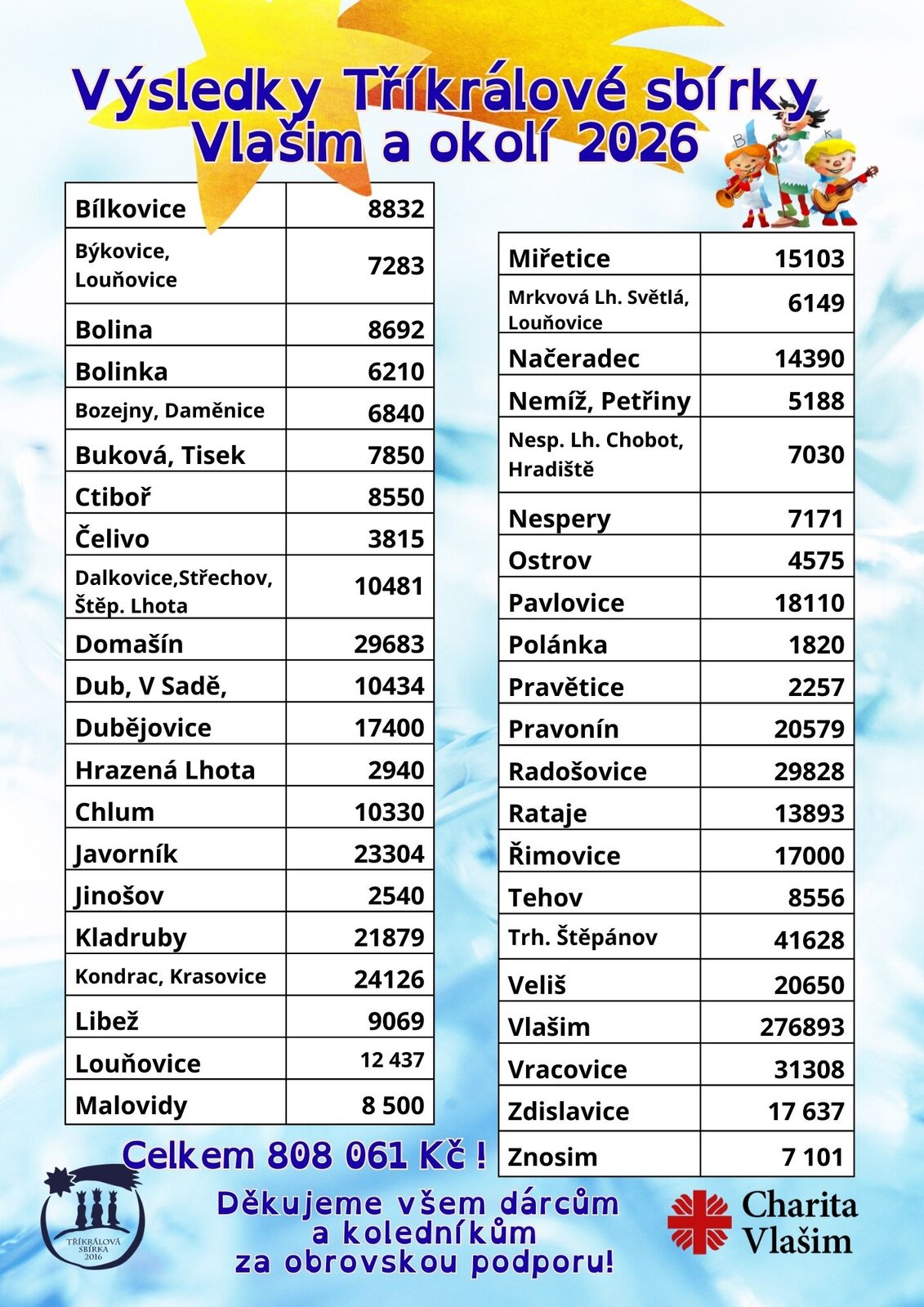 S pomocí Vás všech se v letošním ročníku Tříkrálové sbírky ve Vlašimi a širokém okolí vybrala úžasná částka ve výši 808 061,- Kč. Děkujeme!!!